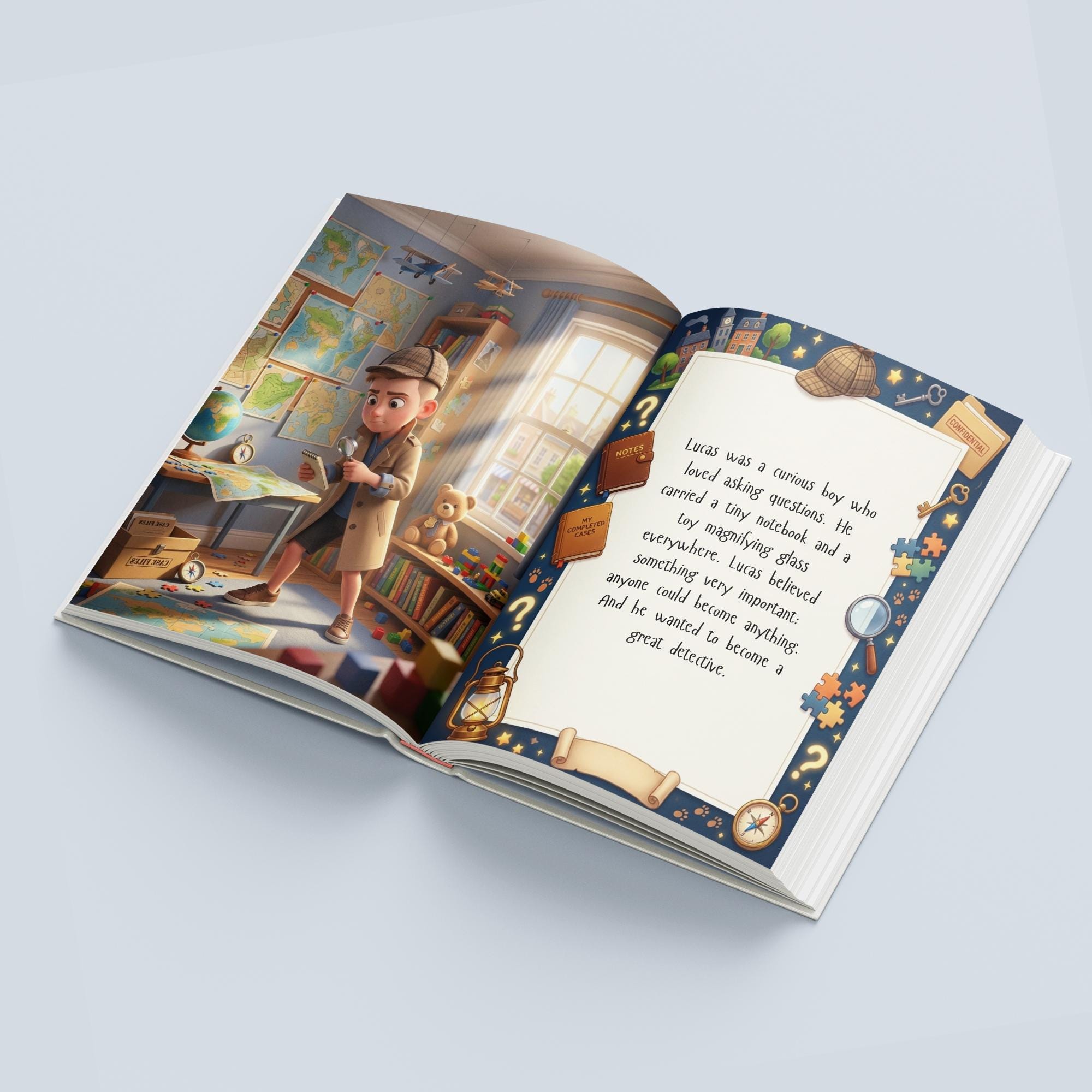 This beautifully illustrated Personalized Detective Mystery Book transforms your child into a clever young detective solving a mysterious case filled with hidden clues, curious suspects, and surprising discoveries.